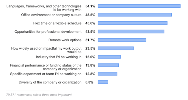 Based on Stack Overflow’s Annual Developer Survey, opportunities for professional development belong to the most important job factors when developers compare two jobs with the same compensation, benefits, and location. Different developers have different priorities when considering jobs.
